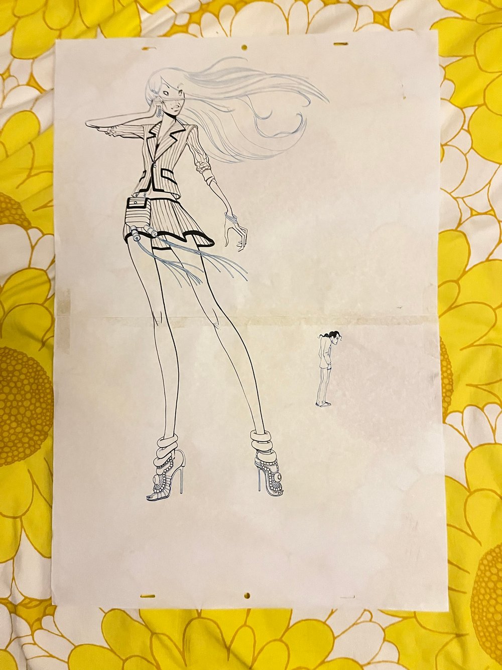 It's the iconic panel of Katariina Kasala, the moment after getting "Masterplasty" surgery, with main character Tomo looking miserable in the background. I would have drawn this in about 2013, redrawn from the much smaller first pass. Another huge image, drawn on two pieces of animation paper taped together left over from my days working as an animator for TV, music videos, etc. Very suitable for framing. Making this available to coincide with the Masterplasty 10th Anniversary edition (also on sale in this very store).